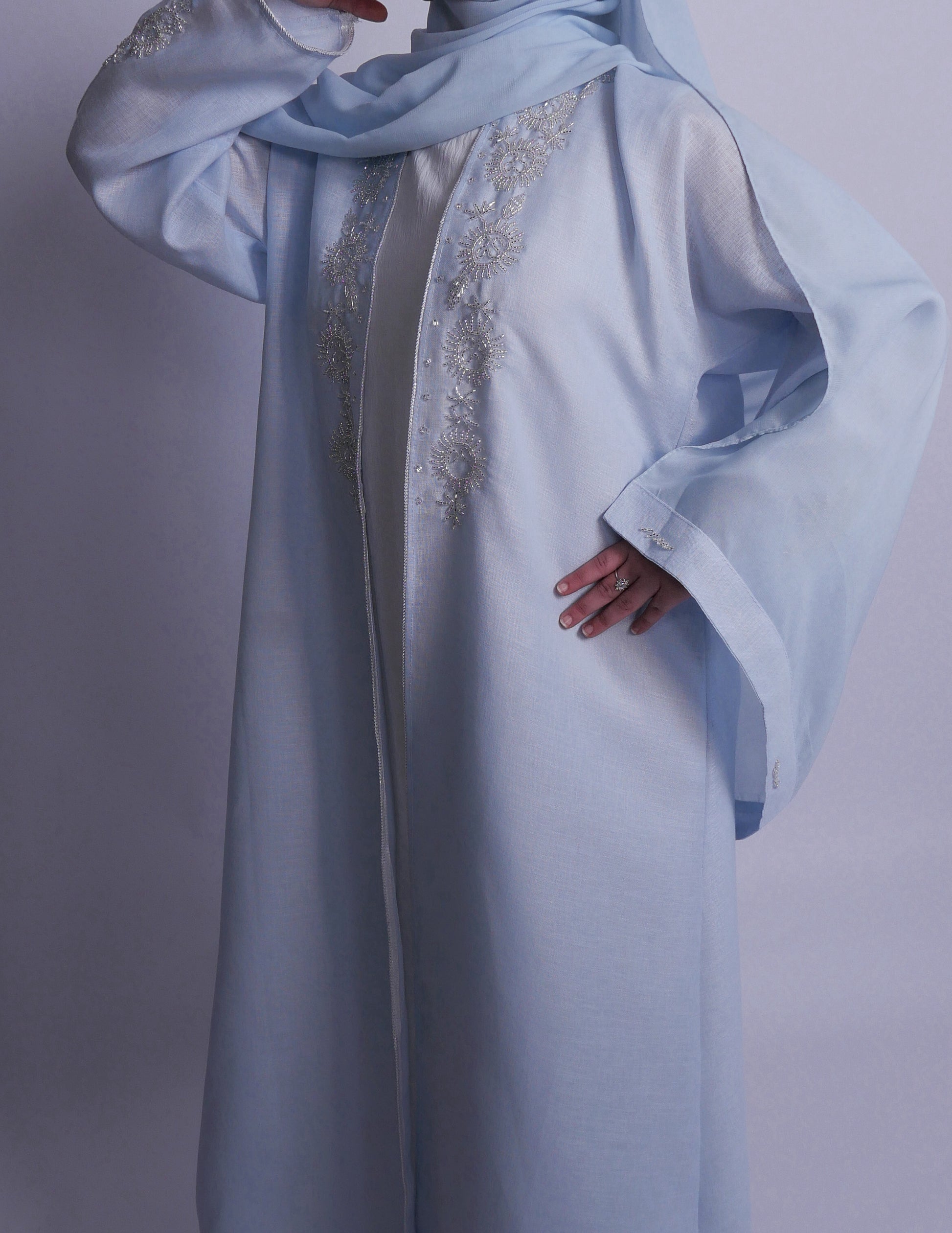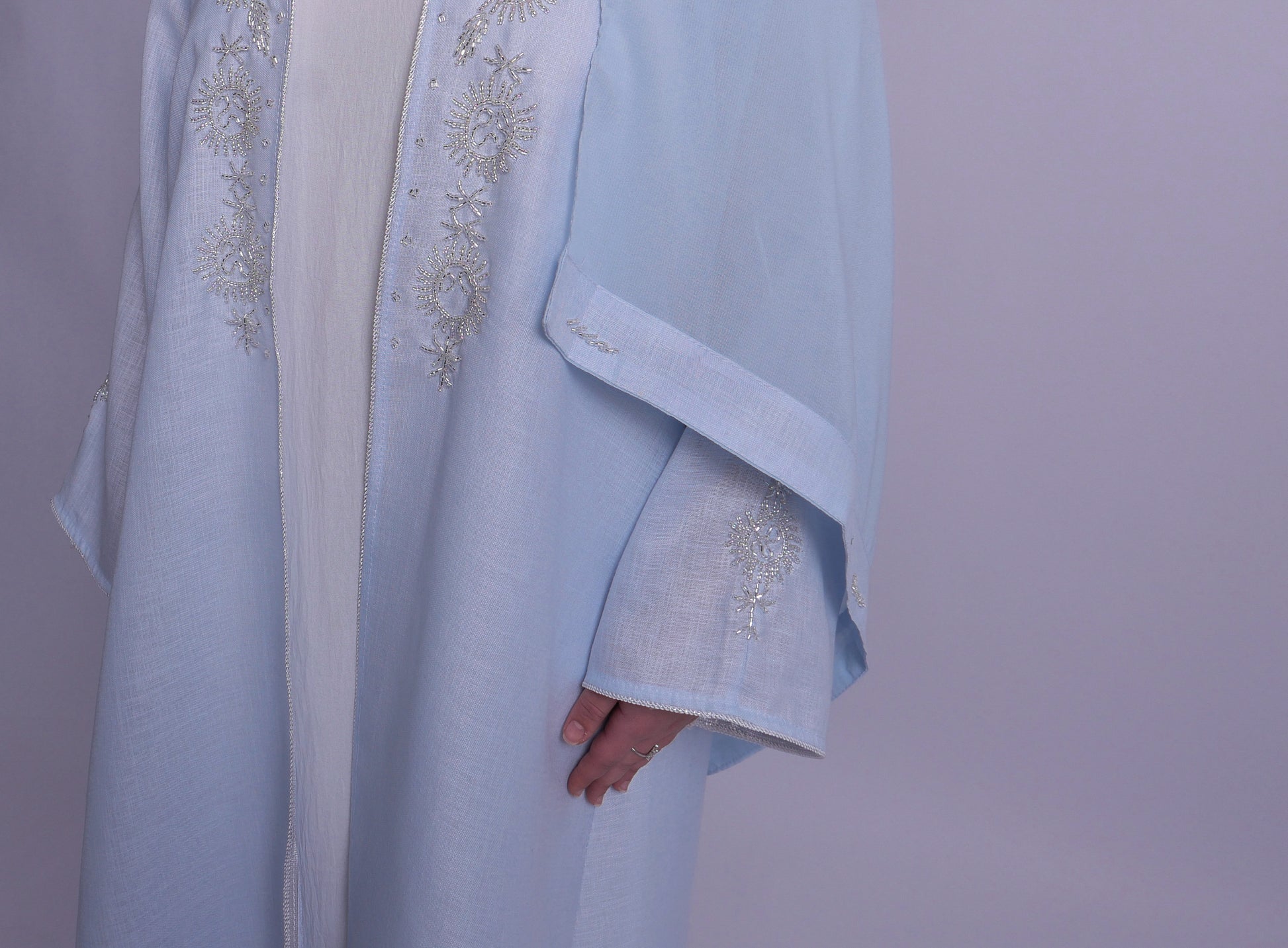 Laissez-vous séduire par notre Abaya Collection Aid en bleu ciel, confectionnée dans un tissu effet lin pour une allure à la fois chic et naturelle. Sous forme de kimono, sa matière légère et respirante en fait un choix idéal pour toutes les saisons, offrant confort et élégance. Ornée de broderies raffinées et de perles délicates sur le devant, cette abaya est parfaite pour les grandes occasions. Accompagnée d’un hijab assorti en mousseline fluide, elle incarne la grâce et le raffinement.